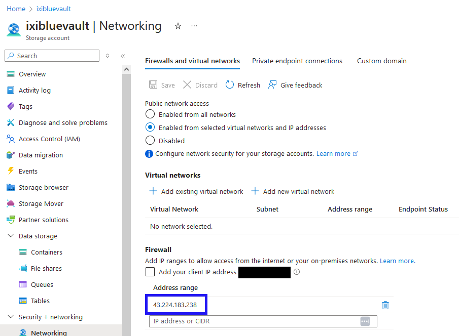 When your storage account was provisioned, you had the option of selecting 'Public network access' values, as seen below. This is not the same as enabling anonymous blob access. During testing, add the public IP address of your NGINX proxy, as well as the public IP address from which you'll be managing the account. If you're using Microsoft Azure Storage Explorer, you must enter your public IP address here to ensure you can administer the bucket and generate SAS URLs/keys.