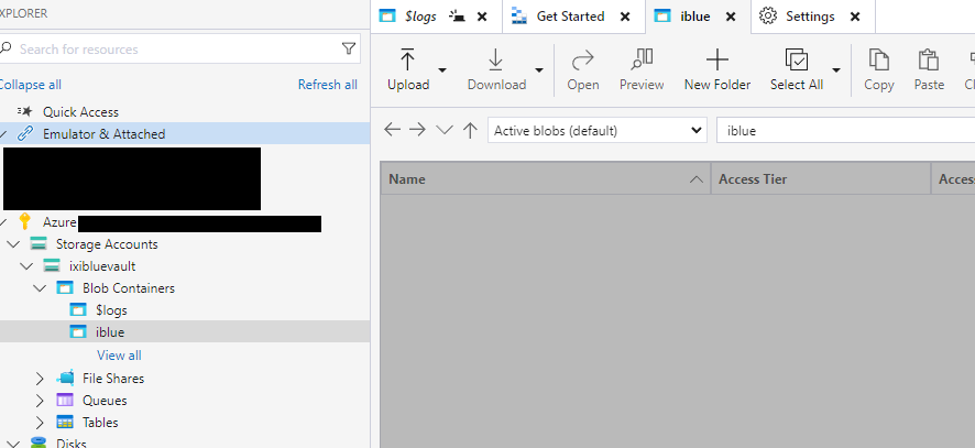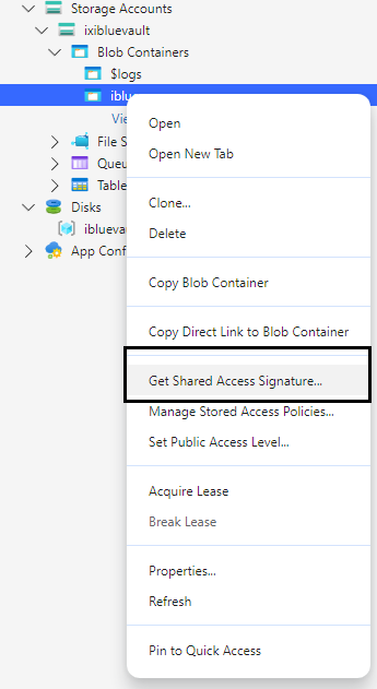 If you don't have one already, right click 'Blob Containers' and create a new one. We're using the 'iblue' bucket in this example.