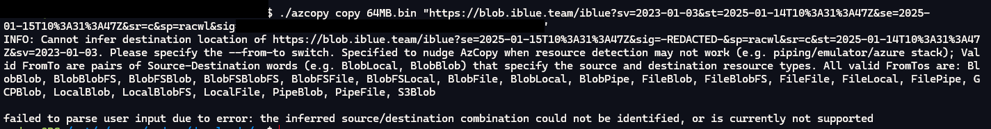 This is fine but it means we can't generate any SAS URLs using the console. We can't do it via the Azure Portal either, since our IP isn't authorised for access. However, we only want to test the upload functionality of AzCopy with these new restrictions.