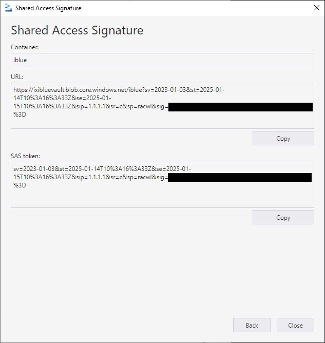 ixibluevault – the name of our Azure Blob storage account (this is setup to only receive connections directly from blob.iblue.team