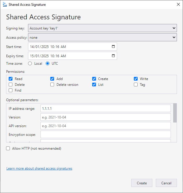 You'll be presented with a range of options to create a signature. To upload/write/add files, create objects, folders, you'll need Read/Add/Create/Write permissions. Select these. If you know the public IP of the host which you're uploading from (or egress IP if it's on a VPN or going through a corporate proxy), then add these values here as an additional control. Setting an expiration is also appropriate given these SAS signatures/keys aren't one time use.&#x20;