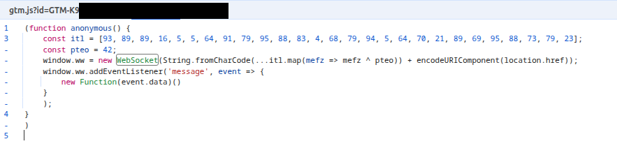 TL;DR - User visits a website, the website loads a Google Tag which contains malicious JavaScript, JavaScript is executed client side, opens a websocket with a remote host and upon each action (entering a field, submitting a page, etc) credentials are sent via the socket.&#x20;